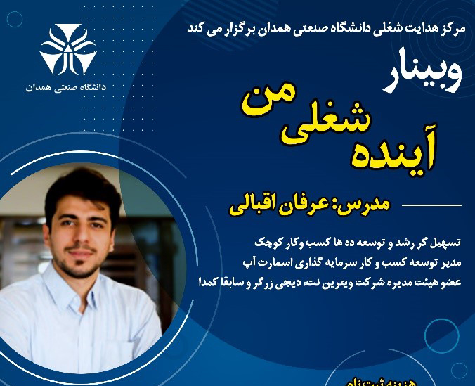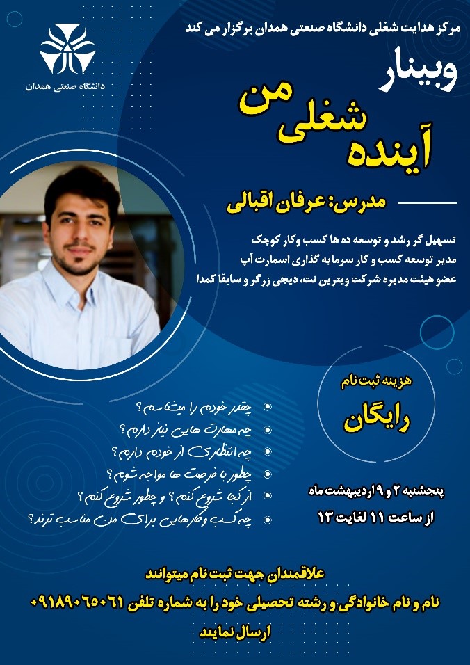 مرکز نوآوری دانشگاه صنعتی همدان به دلیل شیوع ویروس کرونا، به منظور رعایت پروتکل های بهداشتی در مورخ 2 و 9 اردیبهشت ماه 1400 اقدام به برگزاری یک وبینار با عنوان " آینده شغلی من" نمود. اطلاع رسانی جهت ثبت نام در کارگاه از طریق پوستر و در فضای مجازی و وب‌سایت دانشگاه صنعتی همدان انجام شد. در مدت زمان تعیین شده جهت ثبت‌نام حدود 20 نفر جهت حضور در کارگاه اعلام آمادگی نمودند. هزینه ثبت نام در این وبینار رایگان بود. این کارگاه در دو روز مجموعاً به مدت 4 ساعت توسط آقای اقبالی کارآفرین برتر کشوری پیرامون روش های انتخاب شغل در محیط ادوبی کانکت برگزار گردید.
