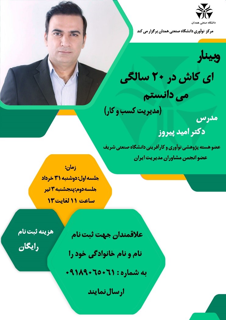 مرکز نوآوری دانشگاه صنعتی همدان در مورخ 31 خرداد و 3 تیر ماه 1400 اقدام به برگزاری یک وبینار با عنوان " ای کاش در بیست سالگی می¬دانستم " نمود. اطلاع رسانی جهت ثبت نام در کارگاه از طریق پوستر و در فضای مجازی و وب‌سایت دانشگاه صنعتی همدان انجام شد. در مدت زمان تعیین شده جهت ثبت‌نام حدود 20 نفر جهت حضور در کارگاه اعلام آمادگی نمودند. هزینه ثبت نام در این وبینار رایگان بود. این کارگاه در دو روز مجموعاً به مدت 4 ساعت توسط آقای دکتر امید پیروز کارآفرین برتر کشوری با موضوع مدیریت کسب و کار در محیط ادوبی کانکت برگزار گردید.