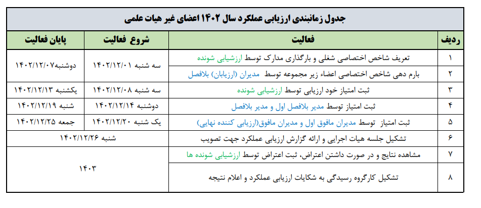 جدول زمانبندی ارزیابی عملکرد سال 1402 اعضای غیر هیات علمی